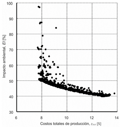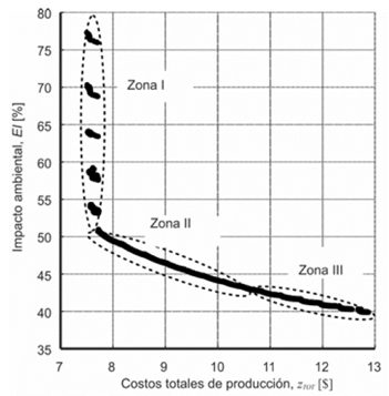 Zona II: Aquí se puede notar un equilibrio aceptable entre los costos y el impacto ambiental. Esta zona es la recomendada cuando se quieren estabilizar los indicadores de sostenibilidad analizados (funciones objetivos de la optimización).