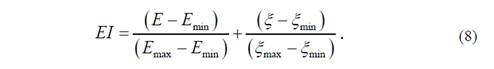 El segundo objetivo es el impacto ambiental. EI, que tiene en cuenta el consumo de energía y el gasto herramental; ambos parámetros fueron normalizados, mediante una interpolación lineal, para poder establecer una relación entre ellos: