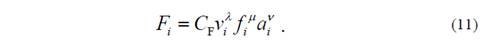 donde C F, λ, μ y ν son coeficientes determinados empíricamente.