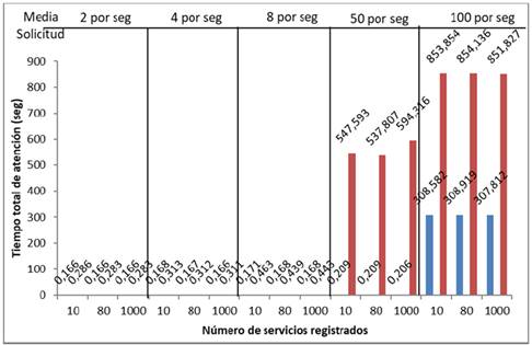 En la Fig. 17 se muestra el comportamiento del sistema respecto del número de servicios registrados en el UDDI y el tiempo total de atención promedio. Se aprecia en esta figura, que cuando la media de solicitud de servicios es baja (2 solicitudes por segundos), ambas propuestas tienen un comportamiento aceptable, incluso similares, en cambio, cuando la media de solicitud es regular (8 solicitudes por segundo) o alta (50 y 100 solicitudes por segundo), la propuesta 2 comienza a presentar resultados muy poco aceptables, pues el tiempo de atención se incrementa considerablemente, mientras que la propuesta 1 comienza a presentar problemas para medias de solicitudes altas (50 y 100 solicitudes por segundo).