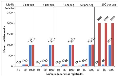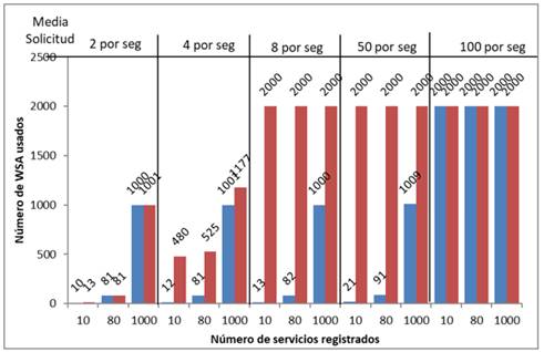 En este caso, se puede apreciar que ambas propuestas no dependen en gran medida de los agentes WSA, pero si requieren tener suficientes recursos para contar con al menos un WSA por cada servicio registrado en el UDDI, puesto que la cantidad de WSA adicionales que se requieren para atender solicitudes en paralelo en este escenario es poco. Note que si hay 10 servicios registrados se requieren 12 o 13 WSA para cada propuesta, para 80, se requieren entre 81 y 86, y para 1000 se requieren menos de 1015 agentes WSA, manteniéndose estos valores prácticamente independientes del número de solicitudes de servicio, lo que también indica que el sistema puede lidiar con la concurrencia en la invocación de servicios, sin ningún problema. El único caso donde se presenta una variación considerable del número de agentes WSA, es para la segunda propuesta cuando la media de solicitudes es de 100 solicitudes por segundo. En este caso, el sistema alcanza el valor máximo establecido de 2000 WSAs.