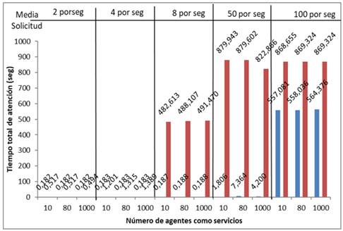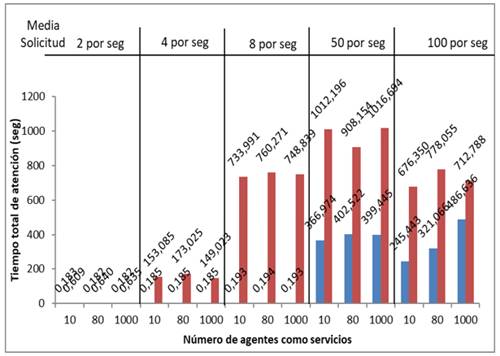 La Fig. 16, muestra una gráfica en la cual se puede deducir rápidamente que la propuesta 2 tiene problemas con el tiempo promedio total de servicio de los agentes, cuando el número de solicitudes por segundo es superior a 8, llegando a superar los 400 segundos, independientemente del número de agentes que ofrecen sus tareas como servicios, lo cual es inconcebible para sistemas que requieren una respuesta inmediata.