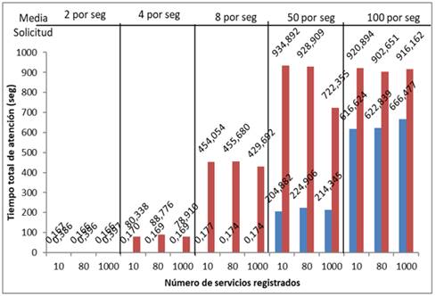 Se puede observar claramente, que los tiempos de atención siempre son mayores en la segunda propuesta y a medida que aumenta el número de solicitudes de servicios por parte del SMA, aumenta también el tiempo de atención total de las solicitudes, siendo mayor la discrepancia en el caso de la Propuesta 2. También se logra apreciar que ambas propuestas son independientes del número de servicios registrados en el UDDI con respecto al tiempo de atención, ya que el tiempo se mantiene más o menos constante para 10, 80 y 1000 servicios para una misma media de solicitud. Por ejemplo, para una media de 2 solicitudes por segundos, el tiempo total de atención promedio en la primera propuesta siempre es de 0,166; mientras que para la segunda propuesta es de 0,283; independientemente del número de servicios registrados en el UDDI. Eso significa que podemos agregar o quitar servicios del UDDI, sin afectar el rendimiento de la plataforma.