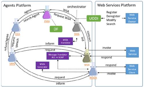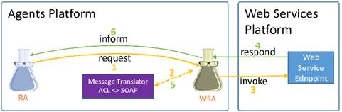 Cuando un agente requiere invocar un WS, WSIG pasa el requerimiento al componente “Web Service Invocation”, el cual traduce el mensaje a SOAP usando el “Message Translator”, y lo envía al endpoint del WS, espera su respuesta, y la retorna al agente solicitante. De forma similar, para que un servicio web comunique a un agente su solicitud la pasa al componente “AgentService Invocation”, el cual traduce el mensaje de SOAP a ACL, y lo envía al agente especificado, espera su respuesta en ACL, y una vez recibida, la remite al WS solicitante en forma de mensaje SOAP. Para que todo este proceso pueda llevarse a cabo, la plataforma debe contar con un servidor web y un UDDI, ejecutándose como servicios de JADE [46-47].
