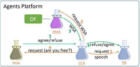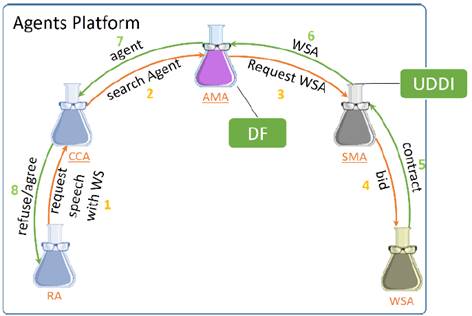 En primera instancia, el agente RA debe preguntar (1) al CCA si es posible establecer comunicación con un WSA (CCA siempre está presente al inicio de la comunicación entre dos agentes, y es quien controla si los agentes pueden entablar una conversación o no). CCA debe buscar si el agente solicitado se encuentra registrado en el AMA (2). De ser así, el AMA responderá con la referencia del agente solicitado (3); CCA preguntará al WSA si está disponible para ejecutar una tarea (4), a lo cual el WSA puede responder afirmativo o negativo (5), dependiendo de esta respuesta, el CCA permitirá o no el inicio de la conversación entre el RA y el WSA (6).