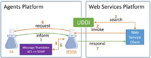 Una vez que el “Web Service Client” ha encontrado al agente WSOA que expone los servicios del agente SA por medio del UDDI, puede invocar dichos servicios, enviando un mensaje SOAP al WSOA (2), el WSOA tomará el requerimiento y lo transformará en un mensaje ACL (3), usando para ello el modulo “Message Translator”, para luego remitirlo al agente (SA) (4). Debido a la naturaleza asíncrona de las comunicaciones entre agentes, WSOA debe esperar hasta recibir respuesta del SA (5), y una vez que tenga la información transformarla en un mensaje SOAP (6) por medio del “Message Translator”, y reenviarla al “Web Service Client” (7) que realizó la solicitud inicialmente.