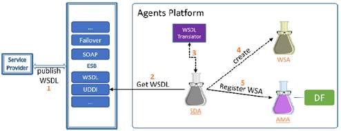 En la Fig. 7 se detalla como un Proveedor de servicios publica sus servicios en el ESB (1), el ESB lo registra en el UDDI, el SDA, al detectar el nuevo registro debe obtener el archivo WSDL correspondiente al servicio web registrado (2), utilizar el módulo “WSDL Translator” para obtener la descripción de un agente que caracterice a dicho servicio (3), para luego crear el agente WSA (4), y registrarlo (5) en el directorio facilitador administrado por el AMA. De forma similar, el SDA respondería cuando se modifica o de-registra un servicio web, efectuando los cambios necesarios en la plataforma.