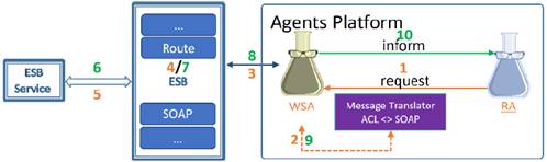 Una vez que el RA tenga permiso para hablar con el WSA, puede invocar sus servicios (ver Fig. 9). Para ello, envía un requerimiento al WSA (1) por medio de un mensaje ACL. WSA usa el módulo “Message Translator” para transformar el mensaje de ACL a SOAP (2), y lo remite al ESB (3), el ESB se encarga de entregar dicho mensaje al endpoint del WS requerido (4 y 5), el WS procesa el mensaje y envía la respuesta al ESB (6) en un mensaje SOAP. El ESB se encarga de entregar este mensaje (en comunicaciones síncronas, WSA bloquea su hilo hasta obtener respuesta del ESB) al WSA solicitante (7 y 8), quien usa nuevamente el “Message Translator” para transformar (9) el mensaje SOAP a ACL, y remitirlo al agente que realizó el requerimiento inicialmente (10).