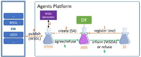 Por otro lado, cuando un agente del MAS es registrado en el AMA, se debe crear automáticamente el WSOA (excepto si el agente que se registra es un WSA) que servirá de fachada para exponer sus capacidades como servicios web en el ESB (el mensaje de registro enviado a AMA, debe contener información que indique cuando crear o no el WSOA). La Fig. 10 refleja cómo se realiza esta tarea. En primer lugar, el agente del MAS (SA) solicita registrarse en el AMA (1); AMA lo registra en su DF y al conocer que el agente requiere un WSOA, lo creará (2). Una vez que el WSOA es creado, utiliza el módulo “WSDL Generator” para obtener un archivo WSDL (3) correspondiente a las capacidades del SA, que serán expuestas como servicios web y publicadas (4) en el ESB (WSOA guarda la referencia del SA al cual presta servicios, ya que lo necesitará para consumir sus servicios). WSOA responderá al AMA si fue posible o no publicar los servicios en el ESB, y dependiendo de la respuesta, AMA informará al SA quien es su WSOA o rechaza el registro del agente.