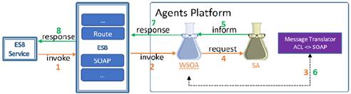 El proceso se inicia cuando el ESB recibe un mensaje (1) para invocar un servicio de agente específico, el ESB se encarga de entregar el mensaje al endpoint del WS perteneciente al WSOA que expone ese servicio (2), WSOA transforma el mensaje de SOAP a ACL (3) usando el “Message Translator”, y remite el resultado al agente SA al cual sirve de fachada (4). En comunicaciones síncronas, WSOA quedará en espera (bloqueo del hilo de ejecución), hasta que SA emita una respuesta. SA procesa los datos e informa el resultado al WSOA (5), el cual debe transformar nuevamente el mensaje de ACL a SOAP (6) usando el “Message Translator”, y remitir el mensaje ya en SOAP al ESB (7), para que éste se encargue de entregarlo al servicio web que realizó el requerimiento inicialmente.