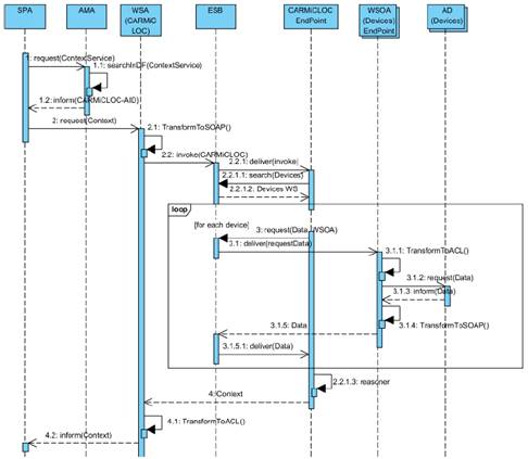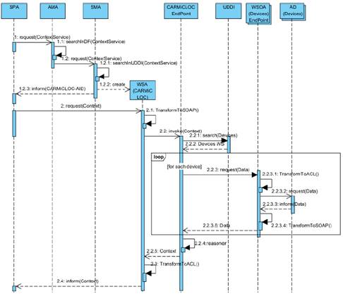 Inicialmente, el agente SPA hace una solicitud al agente AMA (DF), para ubicar un agente que provea un servicio de consciencia de contexto (1); AMA realiza la búsqueda en su directorio (1.1), y no lo encuentra debido a que no existen agentes con esas capacidades en el AMS, y delega la búsqueda al SMA (UDDI), para que verifique si existen servicios que provean consciencia contextual (1.2). SMA busca en su directorio (1.2.1) y consigue a CARMiCLOC, y crea un WSA que caracteriza a este servicio web (1.2.2). Este WSA se encarga de servir como proxy entre el SPA y el mismo CARMiCLOC; el Id del Agente (AID) de este WSA se envía al SPA que realizó la solicitud inicialmente (1.2.3). Nótese que todas estas conversaciones se dan en FIPA-ACL, ya que todas las entidades involucradas son agentes. Una vez que SPA tiene el AID del WSA que brinda el servicio de consciencia contextual, realiza un requerimiento de contexto (2) al WSA; por su parte, el WSA recibe el mensaje, y como está en FIPA-ACL realiza la transformación a SOAP (2.1), y lo remite al EndPoint de Servicio Web de CARMiCLOC (2.2). Como CARMiCLOC necesita tomar datos en AmICL para descubrir y modelar el contexto, debe comunicarse con los sensores y dispositivos presentes en el ambiente que le permitan realizar tal acción. Para ello, debe invocar los servicios de los Agentes que caracterizan dichos dispositivos en AmICL, que son los agentes DA. CARMiCLOC puede descubrir los DA como servicios, realizando una búsqueda de Servicios de Dispositivos en el UDDI de AmICL (2.2.1), donde encontrará los Endpoint de servicio web de los WSOA que sirven de fachada a los DA (2.2.2). De esta forma, CARMiCLOC se comunica con cada WSOA para obtener información del ambiente (2.2.3); cada WSOA transforma el mensaje de SOAP a ACL (2.2.3.1), y lo remite al DA (2.2.3.2), que es quien realmente obtiene la data del dispositivo físico, y una vez que obtiene los datos, los retorna a su WSOA en un mensaje ACL (2.2.3.3), el cual después lo transforma a un mensaje SOAP (2.2.3.4) y lo retorna al EndPoint de CARMiCLOC (2.2.4). CARMiCLOC le entrega el contexto al WSA proxy de CARMiCLOC (2.2.5), quien se encuentra esperando por el resultado. Como WSA recibe los datos en SOAP, transforma el mensaje a ACL (2.3), y remite la información al SPA (2.4), el cual lo usará para razonar y tomar decisiones, de acuerdo a la situación que indique el contexto en ese momento.