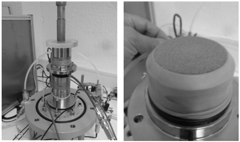 Figura 6: Montaje de la cabeza excitadora sobre la muestra de suelo e inundación de la misma (pasos 8-10).