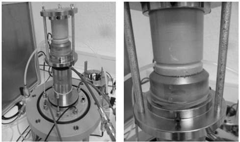 El procedimiento para la fabricación de las probetas, de los materiales ACS y LAD, se indica a continuación. 1) Cálculo de la densidad húmeda (γh), a partir de la densidad seca (γd) y conocida la humedad de homogeneización (wlab). 2) Preparación de la probeta con material homogeneizado, cuya cantidad es estimada con base en la densidad húmeda y el volumen del molde. 3) Colocación del molde tripartido abrazando la base inferior del equipo de CR y apoyado sobre un cilindro hueco bipartido (elevador de molde); el molde tripartido contiene en su interior una membrana de látex que se adhiere a este mediante la aplicación de vacío a través de un conducto lateral. 4) Colocación del material en el interior del molde, mediante compactación dinámica, en cinco capas de igual peso e igual altura. Para la compactación de la última capa se coloca un extensor de molde o collarín sobre el extremo superior del molde tripartido, para evitar la pérdida de material durante la compactación del suelo (Ver Fig. 4). 5) Colocación de un cilindro metálico, de igual altura a la del extensor de molde, sobre la última capa de material en estado suelto. 6) Compactación dinámica de la última capa hasta lograr que el cilindro metálico quede a ras con el collarín; de este modo se garantiza la densidad especificada. 7) Remoción del cilindro y el collarín que se utilizaron durante la compactación de la última capa (Ver Figs. 5 - 8) Colocación de la estructura porta cabeza excitadora, con el fin de asegurar la verticalidad de la cabeza excitadora durante el montaje de las probetas. 9) Colocación de la cabeza excitadora apoyada sobre la muestra y firmemente asegurada a la estructura portadora. 10) Remoción del vacío aplicado entre la membrana de látex y el molde tripartido e inundación de la probeta. Debido a que, en general, los equipos convencionales de columna resonante adolecen de drenaje superior a través de la cabeza excitadora, lo cual dificulta la saturación de las probetas por la imposibilidad de remover el aire atrapado tanto en el sistema como en el interior de la muestra, en esta investigación se le dio solución a este problema mediante el flujo lento ascendente, originado por acción de la gravedad. El flujo lento se mantiene hasta el momento en que empieza el goteo a través de la interface formada por la muestra y la cabeza excitadora (Ver Figs. 6. 11) Remoción del elevador de molde y sujeción de la membrana de látex tanto a la cabeza excitadora como a la base inferior del equipo de CR, mediante un par de sellos “O’-Rings”. 12) Aplicación de vacío al interior de la probeta. El objetivo de aplicar vacío, a través del drenaje inferior, es garantizar la estabilidad de la probeta mientras se completa el proceso de montaje del equipo. 13) Remoción de todos los accesorios utilizados para la fabricación de las probetas (Ver Figs. 7. 14) Colocación de la célula triaxial interior que sirve de soporte al sistema excitador. 15) Instalación del sistema excitador. 16) Instalación de los transductores de proximidad y del LVDT destinado a medir las deformaciones axiales. 17) Conexionado de los transductores de presión y cambio volumétrico. 18) Finalmente, montaje de la célula triaxial exterior (Ver Fig. 8).
