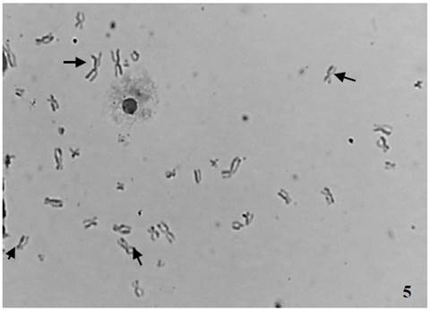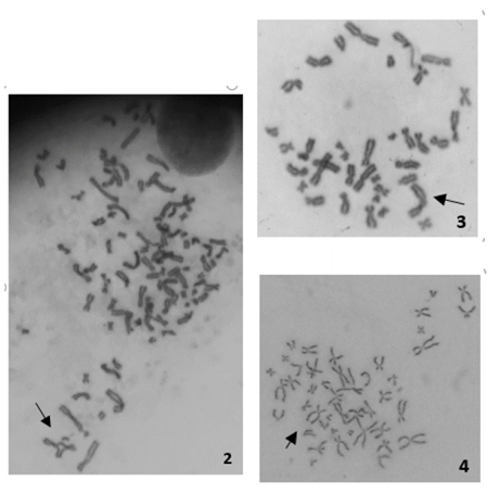 Figuras 2, 3 y 4: Aberraciones cromosómicas observadas en cromosomas obtenidos a partir de linfocitos humanos expuestos a NTC (Figura 2: figura multirradial, Figura 3: cromosoma dicéntrico, Figura 4: quiebre cromatídico).