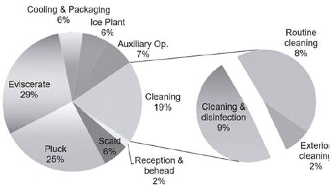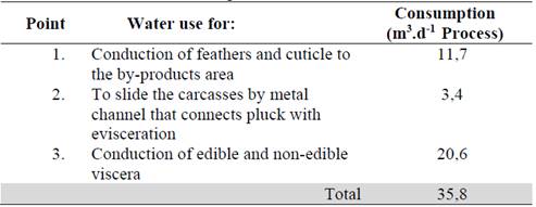 The cleaning activity was between 13% and 23% of the water use (Table 6), both in the maximum and in the average of one day of operation. However, it is important to note that the percentages of cleaning variation indicated are not because this activity increased with the duration of the slaughter process, because 94% of it was independent of the process. The increase found was due to a faucetless hose used to rinse the floor located in the scalding and plucking areas. The consumption for this activity was between 38,8 and 41,0 m3 representing 2,9 and 5,5 L per chicken, for the average and minimum capacity. The lowest capacity is explained by the minimum requirements of slaughter process, since cleaning must be performed for one or six batches, the carried out the same throughout the plant.