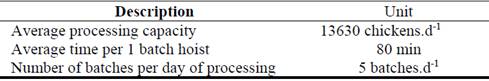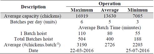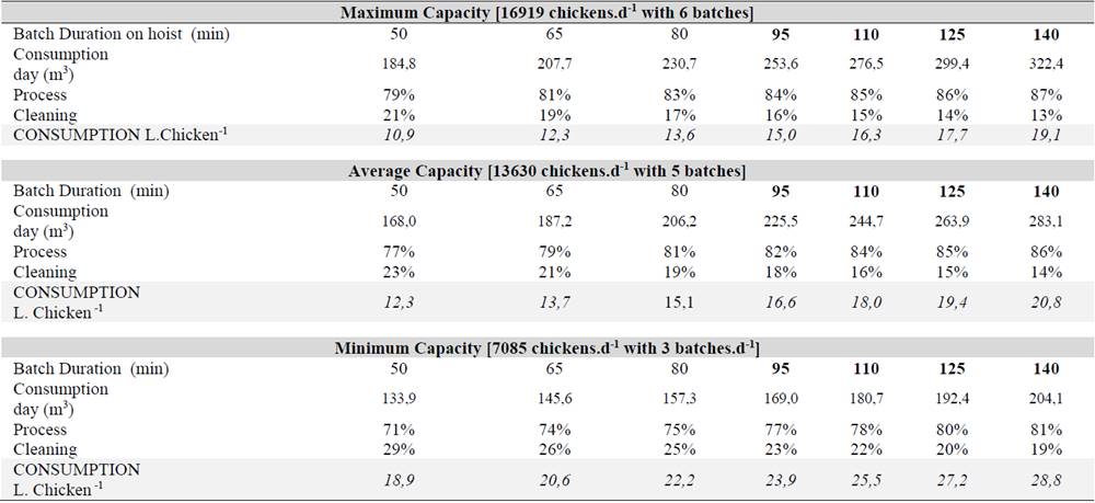 In order to analyze the liters consumed per chickens and to evaluate trends and behaviors of the water consumption in a day of operation, values such as the number of chickens processed, the number of batches and their duration were analyzed. In Table 4, the actual plant performance values and their maximum, average and minimum processing capacities are presented. These values established the operating range of the plant, between 50 and 140 minutes per hoist one batch.