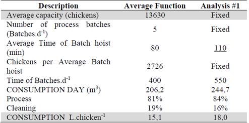 The sensitivity analysis allowed to evaluate the efficiency of the process and to quantify the increase of the water consumption to the maximum, average and minimum capacity. For each, an increase of 1529L, 1279L and 780L per minute was found, respectively, showing a range between 10,9 and 28,8L per chicken. This sensitivity analysis corroborated a lower number of slaughtered chickens, corresponds to a higher water demand. The high consumption of water also responded to practices of water wastage included prolonged leakage, lack of maintenance, hoses without control valves for closure and water based transport. This condition is partly propitiated by having an abundant water supply at a low cost. Inattention to water wastage encourages high consumption in the facilities.