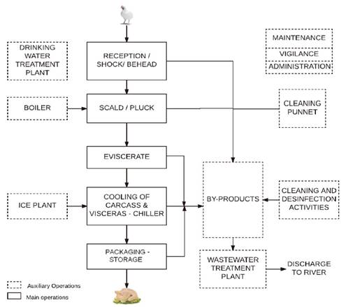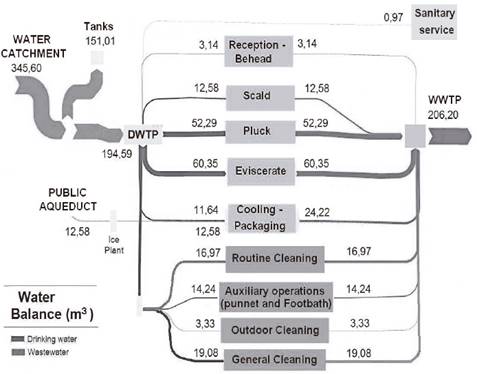 Visits were made to a poultry processing plant to understand the processes performed there. Each area of the enterprise was inspected with regard to water use on equipment and activities performed by the operators, including the state of the infrastructure. The daily logs of the process and the technical feature of the teams were also evaluated. Primary and secondary information from the literature review was compiled and then contrasted with our collected data. All points of access to water in the plant were identified and inventoried by area, identifying the points where the water was used and where it was poured, as well as a photographic survey of the leaks. In addition, we identified which units were directly required for the process and which were only auxiliary operations. For water supply, the company had two supplies, the main one came from a surface water source that worked on gravity and provided 95% of the water which supplied average flow of 4 L.s-1 and the another came from the local public aqueduct destined for the generation of ice. This requires to be driven by pumping. Due to the lack of water flow meters in the plant, it was necessary to carry out a water balance. With the volumetric method, the flow rates of the productive areas were calculated. For this, chronometers and buckets (12L) were used, and for each measurement 3 replicates were made. Finally, an material flow analysis was performed using the trial version of the software e!Sankey 4 calc, 4.4.07513 for 14 days of august of 2017.