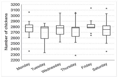 Fig. 2 shows the number of chickens slaughtered for each batch. For all period evaluated the median was around to 2780 chickens. In terms of interquartile range this oscillates between 2600 and 2860 chickens, such difference was due to the capacity of the truck and / or production on the farm. The size of the boxes shows a very similar dispersion from one day to another, being minimal in the case of Friday, showing homogeneous batch, perhaps by factors such as the allocation of the same farm. The minimum and maximum atypical values found for the number of slaughtered chickens per batch were 2290 and 3140 respectively, thus indicating the flexibility of operation that the plant has by batch. Such variations are caused by the number of chickens caged according to the sex and weight of the animal sent in each batch.