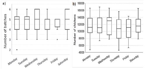 The Fig. 3(a) shows numbers of batches per day. The median was 5 batches by day, except on Thursday. Wednesday and Saturday had the greatest dispersion with an interquartile range between 4 and 6 batches. This is reflected in the processing capacity of a day of sacrifice, Fig. 3(b), where the median of Wednesday was the highest with 13000 chickens to coincide with the highest number of batches processed. For the other days, the median was reiterative, close to 11200 chickens, with a homogeneous distribution and an interquartile range between 8000 and 14000 chickens, as well extreme values between 4200 and 17000 chickens were observed.