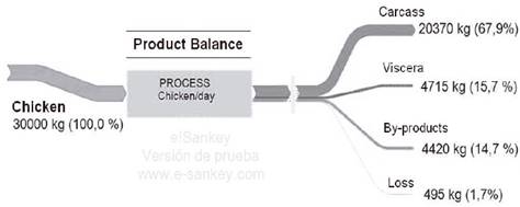 Based on average operation conditions, the mass balance indicated that the chicken carcass product amounted to 67,9% of the total, edible viscera 15,7% and by-products and losses the remaining 16,4% (Fig. 5). The percentages found correspond to the reported for a chicken carcass weight between 67% and 75% [29] and a by-product weight of 20% [27].