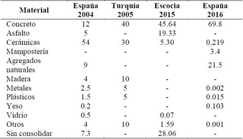 El inventario o cantidad producida de residuos, es uno de los criterios con mayor peso, para identificar la oportunidad de reutilización de residuos de demolición y construcción. Dentro de los RCD que se producen en mayor cantidad a nivel mundial, los concretos se ubican el primer lugar en porcentaje de producción, seguidos de las roturas cerámicas y la mampostería, siendo estos residuos los que han concentrado la mayor cantidad de esfuerzos de reincorporación dentro de la cadena productiva de la construcción. La Tabla 1, muestra la producción porcentual de RCD discriminada, para algunos países de Europa.