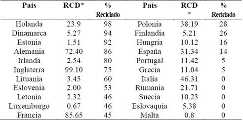 Tabla 1: Producción porcentual discriminada de RCD en Europa.