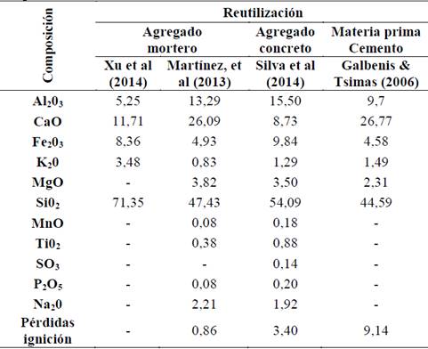 Como se indicó en la sección anterior, son pocos los investigadores que han reportado la caracterización de los residuos, como un criterio fundamental para decidir si un residuo tiene potencial aplicación. Debe considerarse que la reutilización de un residuo de demolición y construcción depende, por su puesto, de sus características y del efecto que estas pueden tener sobre las condiciones finales de un producto. Muchos autores presentan criterios asociados al tamaño que según el país y el tipo de aplicación debe cumplir una norma (en Colombia en el caso de los agregados para concretos y morteros la distribución de tamaño de partícula debe ajustarse a NTC 174 y en pavimentos a INV E- 213 y INV E- 214 y de absorción de agua. Respecto de la caracterización mineralógica, de la revisión bibliográfica, lograron extraerse algunos datos sobre la química de los minerales que los hacen susceptibles a ser usados. Para la reutilización como agregados se requieren altos contenidos de sílice y calcio (>20% y >10% respectivamente) y para reutilización como remplazo de cementantes o puzolanas elevados contenidos de CaO (>18%) y alúmina, como puede revisarse en las Tablas 3 y 4.