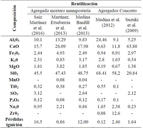 Tabla 3: Composición mineralógica de residuos mampostería según aplicación. Adaptado de varios autores.