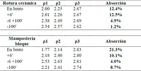 En la Tabla 5, se resumen los resultados obtenidos para absorción y densidad de residuos de mampostería y de roturas cerámicas. En el caso de los bloques-separadores que están compuestos de elevadas cantidades de cemento y cuyo tamaño de partícula es muy fino, no fue posible una determinación de la absorción por el método mencionado, pero se encontró que su densidad media es 3.01 g/cm3.