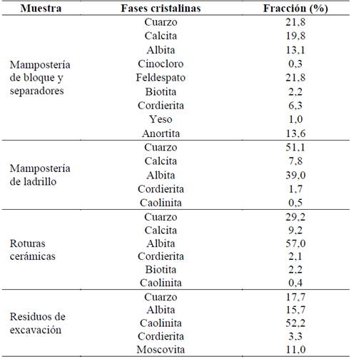 En la Tabla 6 se resume la caracterización mineralógica respectiva, obtenida por comparación de patrones de difracción. La fase cuarzo (SiO2), los feldespatos: Albita, Anortita y Plagioclasa, y el carbonato de calcio son las fases dominantes en los residuos cerámicos analizados. Los residuos de excavación son los únicos que presentan fases arcillosas tales como moscovita y caolinita. Las cantidades disponibles de aluminio se reportan asociadas a minerales como la cordierita y algunos filosilicatos como la biotita.
