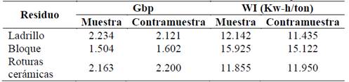 En la Tabla 7, se resumen los índices de trabajo para los residuos evaluados. Por sus condiciones naturales, los suelos no son materiales considerados para ser reducidos de tamaño.