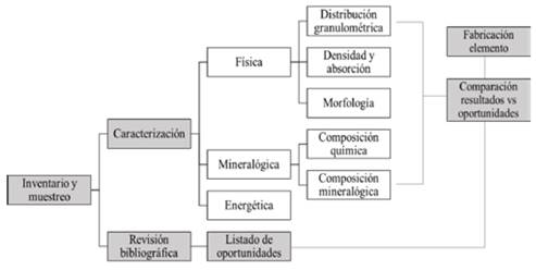 Luego, con los resultados de la caracterización completa, se procede a comparar respecto del uso que la literatura reporta para los residuos que se identifican con el mayor potencial de utilización, ya sea por su calidad o por su inventario. Una vez realizada la toma de decisiones, se fabrica un modelo de aplicación. En la Fig. 1, se muestra un esquema de la metodología experimental empleada en este estudio.