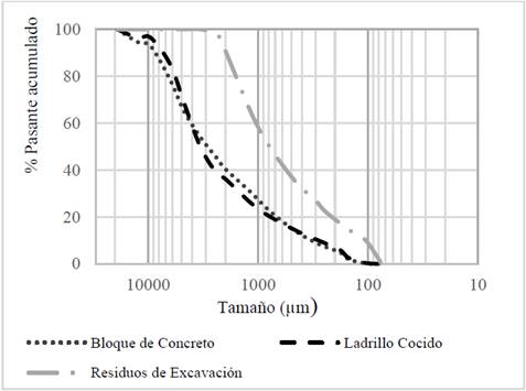 Figura 2: Curvas granulométricas de RCD estudiados.