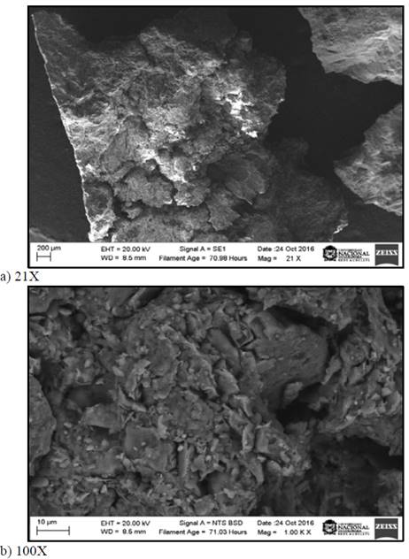 Figura 3: a) y b). Imágenes SEM de partículas de residuos de mampostería de bloque. Morfología tipo “blocky”.