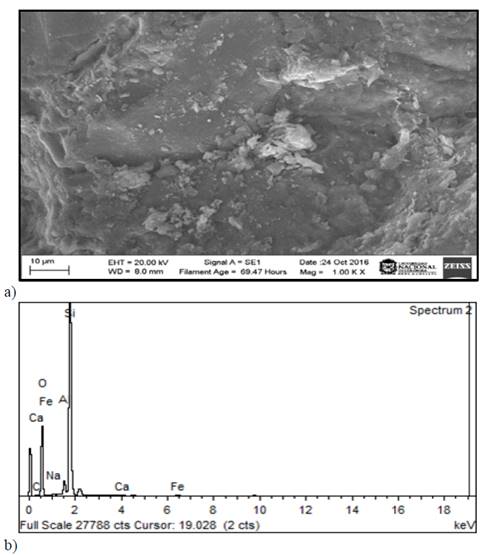 Figura 5: a) Imagen SEM de partículas de residuos de excavación. b) Caracterización química local por EDS para residuos de excavación. Imágenes obtenidas en el presente estudio.