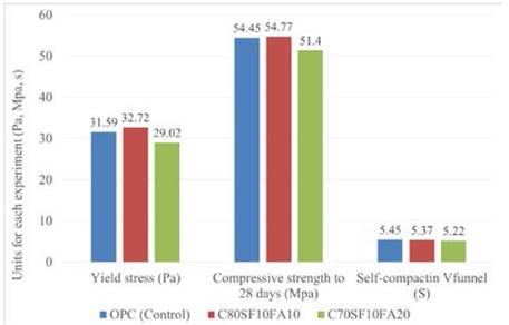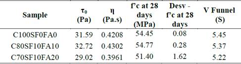 For instance, as the SF increases from 5% to 10% the yield stress increases by about 20%, the viscosity by 10% and the evacuation time by 17%; this due to its particle size and its reactivity that allows it to act as nucleation centers and promotes particle to particle interaction to increase friction among them as well as the formation of flocs. Otherwise happens with the FA, which, due to its larger particle size less reactivity and spherical shape interrupts the formation of flocs and acts as plasticizer or lubricant and also decreases the compressive strength. It can also be established that by mixing these two additions their effects combine and interact, allowing to look for a mixture that meets the parameters of low yield stress, high compressive strength, low viscosity and short evacuation time (self-compacting).