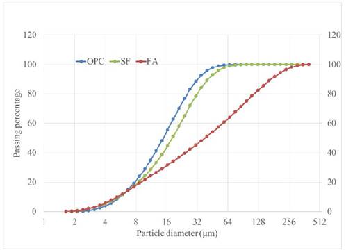 The result of the PSD is featured in Fig. 1, where it can be seen that the OPC is the finest material and the FA the thickest one in comparison with other materials;