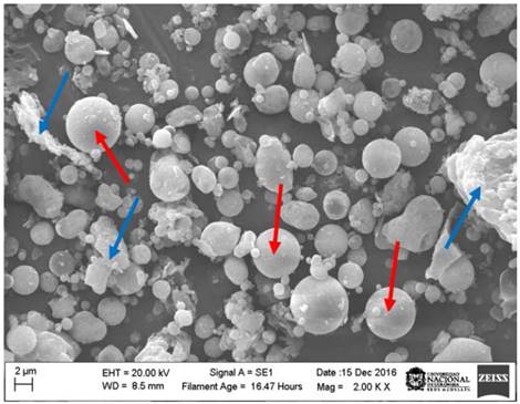 The red arrows show the spherical shapes of the FA of various sizes, some irregular shapes indicated by the blue arrows obey to the unburned ones, which are of the order of 4.37%, measured on the FA by the ASTM D3174 standard. Figure 4 shows SF particles of different sizes and many on the nanometric scale with spherical shapes, this shows that a good part of what is being measured in PSD are agglomerations of SF.