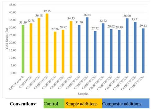 Fig. 6 shows that for simple additions, yield stress values are lower for samples added with FA than for samples with SF; thus making clear that FA contributes more to the workability of the mixture, with a decrease in the fluidity stress up to 20% on average with respect to the addition of SF. Both for the additions of FA as well as for SF as their amount increases in the mixtures the yield stress increases and only the samples with FA additions of 10% and 20% show values below the control sample. For composite additions it can be noticed that three mixtures are below the value of the control sample, with 20% and 30 % of FA, which corroborates that the presence of FA decreases yield stress in some cases.