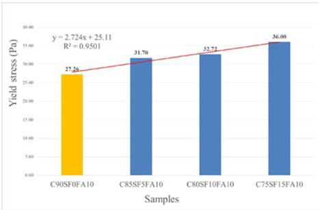 Figure 7: Trend of yield stress for mixtures with 0 to 15% SF and 10% constant FA.