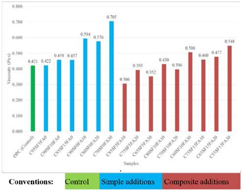 Fig. 9 shows the viscosity value (calculated with the Binghan model) of the analyzed mixtures. In general, it can be noticed that the viscosity of the mixtures increases for all simple additions; however, there is a more pronounced viscosity increase for additions with FA and lower for additions of SF; probably this is because the particle size of the FA is more than 5 times the size of the cement, while the size of the SF is of the order of the size of the OPC and smaller. Regarding the composite additions it can be seen that there are some mixtures with lower viscosity values with respect to the control sample; such mixtures have additions in few proportions, this behaviour is due to the phenomena of rolling and lubrication by small particles and packing phenomena, up to a certain number of particles where energy is spent in moving all the particles present. This again corroborates a complementary effect between these two mineral additions.