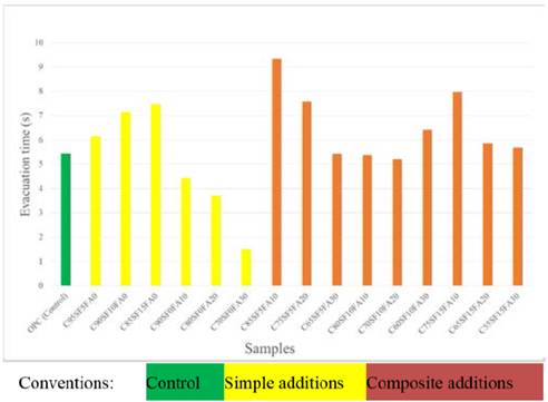 Fig. 11 displays the evaluation time for the V -funnel test for each prepared mixture. Regarding simple additions, a direct relationship appears for SF, since as the quantity increases, so does the evaluation time. Conversely, for mixtures with FA the relation is inverse, the evaluation time decreases as its concentration increases. This is due to the fact that SF is quite reactive and it reduces the workability of the mixture, while the FA being less reactive interrupts the formation of flocs serving a plasticizing function. No ternary mixture showed a significantly shorter evacuation time than that of the evacuation time of the control mixture; thus the reactivity of the SF is possibly more decisive than the plasticizing that the FA delivers to the mixture.