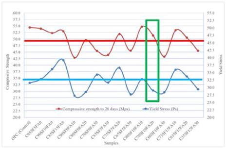 In Fig. 12 the red line defines the mean value for the compressive strength at 49.51 MPa and the blue line defines the mean value for the yield stress at 32.21 Pa. The green box shows the mixture having a compressive strength avobe average and the yield stress below the mean value. For the present case a single mixture meets the optimal conditions: 10% SF and 20% FA.