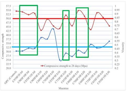 In Fig. 13 the red line defines the mean for the compressive strength at 49.51 MPa and the blue line defines the mean value for the viscosity at 0.4575 Pa·s. The green boxes show six mixtures that meet the ideal conditions; for this case, all simple mixtures with SF, and composite mixtures with 5% SF + 20% FA; 10% SF with 10% and 20% FA.
