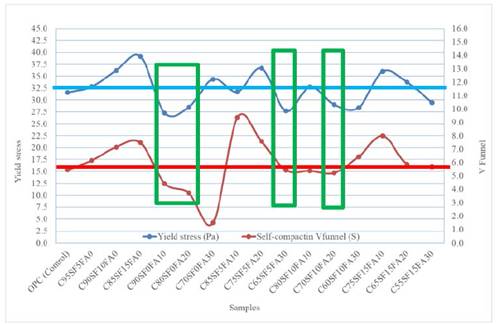 In Fig. 14 the blue line is the median for the yield stress at 32.21 Pa and the red line defines the median for the self-compacting V funnel test at 5.77 s. The green boxes show 4 mixtures with ideal conditions: two mixtures with simple additions: 10% and 20% FA; and two mixtures with composite additions: 5% SF + 30% FA and 10% SF and 20% FA.