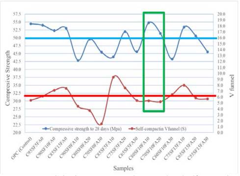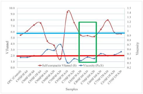 In Fig. 16 the blue line defines the median for the compressive strength at 49.51 MPa and the red lines defines the median for the self-compacting V funnel test at 5.77 s. The green boxes feature 2 compound mixtures with ideal conditions: 10% SF with 10% and 20% FA.