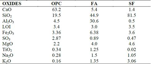 The results obtained by XRF of both cement and mineral additions are provided in Table 1. The OPC has low contents of limestone, this due to both low losses on ignition and high content of CaO. The FA is an ash class F, because the sum of its main oxides (SiO2 + Al2O3 + Fe2O3) is greater than 75% [27]. Regarding SF, a high purity material with high SiO2 content and low contents of other oxides is observed [28].