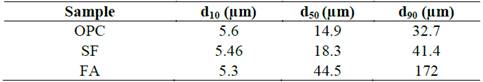 Table 2 shows the passing size (in microns) that has a certain amount of material: d10, d50 and d90 for 10%, 50% and 90%, respectively. In this table it is confirmed that the fine material is the OPC and the thickest one is the FA.