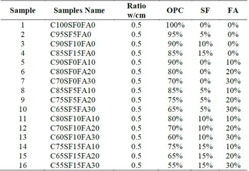 In this study the samples that comply with the proposed variables are C80SF10FA10 and C70SF10FA20, nonetheless, the chosen one is C70SF10FA20 since it allows maximizing the percentage of replaced cement with the corresponding additional benefits, in terms of environmental and economic aspects.